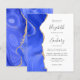 El borde izquierdo de esta elegante y moderna invitación a la boda incluye un borde de batido de color azul real adornado con un falso purpurina de oro. El texto del personalizable combina escritura a mano, copperplate y cursiva en gris carbón sobre fondo blanco. El reverso presenta un diseño a juego con el azul real y el agate dorado.