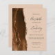 El borde izquierdo de esta elegante y moderna invitación a la boda incluye una pasarela de color marrón mocha bordeada por un falso purpurina de oro. El texto del personalizable combina escritura a mano, copperplate y cursiva en gris carbón vegetal sobre un fondo bronceado. Añada detalles adicionales en la parte posterior, junto con un código QR para ayudar a sus huéspedes a visitar su sitio web boda.