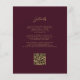 El borde izquierdo de esta elegante y moderna invitación a la boda incluye una acuarela color rojo burdeos recortada con un falso purpurina de oro. El texto de personalizable combina guiones de color dorado y fuentes sans serif en un fondo burdeos. El reverso proporciona espacio para los detalles del boda sobre un fondo burdeos sólido, junto con un código QR que los huéspedes pueden escanear para visitar su sitio web y RSVP, lo que ahorra el coste de imprimir y enviar tarjetas RSVP separadas.