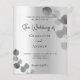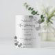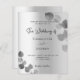 Una invitación a la boda moderna, elegante y minimalista. Fondo de aspecto metálico de color plateado falso decorado con eucaliptos, brotes. Personalice y agregue sus nombres y detalles del boda. Letras de color negro.