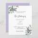 Un elegante fondo blanco en la parte delantera. Decorada con eucalipto y flores de lavanda. Personalice y agregue sus nombres y detalles. Fondo de color lavanda.