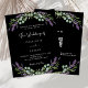 Un fondo negro decorado con flores de lavanda y vegetación eucaliptica. Personalice y sus nombres y detalles. Atrás: agregue la URL de su sitio web boda al código QR para obtener más detalles y/o RSVP. 1 hoja = 1 borde impreso de invitación al borde.