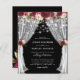 Invitaciones a bodas de presupuesto rústico con un elegante fondo negro de pizarra que se puede cambiar a cualquier color, una variedad de flores marsala de color rojo, burdeos y rosa oscuro, cortinas bodas, luces de cuerda y una plantilla personalizada de boda.