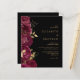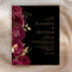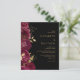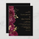 Esta romántica invitación a la boda floral incluye una frontera de flores de Borgoña con un follaje de Relieve metalizado de imitación dorada. Los nombres de la pareja aparecen en el clásico tipo de letra serif de color dorado, con el texto restante en cursiva, en un fondo negro.