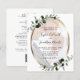 Presupuesto todo en una invitación a la boda metálica de oro de Eucalyptus... La invitación a bodas botánicas "All in One" (Todo en Uno) con presupuesto incluye un marco oval metálico dorado adornado con hojas de eucalipto de salvia y verde esmeralda que bordean una foto de la novia y el novio con un fondo blanco fresco. Su foto se colocará sobre una capa bajo una transparencia blanca para "atenuar" los colores de alguna manera, de modo que el texto de la parte superior sea legible. La parte posterior de la invitación contiene todos los detalles que normalmente se verán en las tarjetas separadas del paquete boda. Esta moderna invitación a la boda fue diseñada para ser a la vez elegante y de bajo costo... por no hablar de ahorrar tiempo. En la parte posterior también hay una plantilla de gráfico de código QR que puede reemplazar con su propio código (o borrar si no tiene previsto usar uno... también - no olvide eliminar el texto que hace referencia a la información de código QR). Todo el texto de ejemplo se puede revisar fácilmente con su propia información sobre la plantilla de personalización. NOTA: Las tarjetas de presupuesto no vienen automáticamente con sobres, al igual que las invitaciones tradicionales, pero puedes comprarlas en la misma página en el momento del pago si lo deseas. Todo ello en un mismo diseño también está disponible en una tradicional invitación de boda las 5 horas del día, los 7 días de la semana.