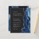 El borde derecho de esta elegante y moderna invitación a la boda incluye un borde de batido color azul marino adornado con un falso purpurina plateado. El texto del personalizable combina serif de color gris plateado, copperplate y fuentes cursivas sobre un fondo negro de pizarra. El reverso presenta un diseño de ágata color azul marino y plata.