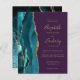 El borde izquierdo de esta elegante y moderna invitación a la boda incluye una verde azulada barra acuática recortada con un falso purpurina de oro. El texto del personalizable combina la escritura a mano de color dorado, el copperplate y las fuentes cursivas sobre un opulento fondo violeta profundo. El reverso presenta un diseño de agate verde azulado y dorado a juego.