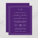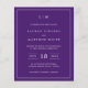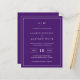 Una sencilla invitación a bodas con un diseño moderno y elegante, con su monograma de dos letras en la parte superior, un diseño de fecha audaz y sus detalles rodeados de un delgado borde. Todos los elementos de diseño están en blanco sobre un fondo morado y pueden cambiarse en la herramienta de edición de diseño. Una moda y un diseño de diseño, ideal para una pareja minimalista.