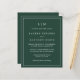 Una sencilla invitación a una boda económica con un diseño moderno y elegante, con su monograma de dos letras en la parte superior y sus detalles rodeados de un delgado borde. Todo el texto está en blanco sobre un fondo verde del bosque. Las fuentes y los colores de fondo pueden cambiarse a los colores que desee pulsando el botón "personalizar". Estas invitaciones de boda baratas son estupendas para una pareja minimalista.