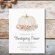 ¿Estás planeando un Fiesta de la Cena de Acción de Gracias? Esta invitación de presupuesto incluye una hermosa calabaza de acuarela blanca y follaje otoñal. Personalizable fácil. Acuarela original © Michele Davies.