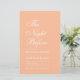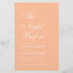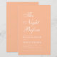 Una simple y minimalista invitación a la cena de ensayo con melocotón. Tiene solo texto blanco sobre fondo de melocotón. El título "La Noche Antes" está escrito en caligrafía elegante, la ocasión "Cena de Ensayo" y el nombre están escritos en mayúsculas grandes, el resto en minúsculas. El texto está alineado a la izquierda.