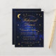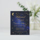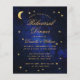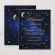 Una invitación para una cena de ensayo con presupuesto limitado para una boda con tema celestial, con la luna y las estrellas sobre un fondo azul de noche estrellada. El título Cena de Ensayo y los nombres están escritos en una elegante letra caligráfica. La luna y las estrellas son de falso foil dorado, el texto es dorado. Sobre el negro, solo está la luna y las estrellas sobre un fondo azul de noche estrellada.