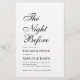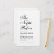 Una sencilla y minimalista invitación a la cena en blanco y negro. Sólo tiene texto negro sobre fondo blanco. El título "La noche antes" está escrito en caligrafía elegante, la ocasión "Cena ensayista" y el nombre está escrito en mayúsculas, el resto en gorras pequeñas. El texto queda alineado a la izquierda.