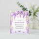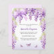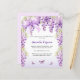 Un elegante fondo blanco y violeta, decorado con flores de glicinia de color lavanda, mariposas y un arco. Personalice y agregue un nombre y detalles del fiesta. De vuelta: lavanda coloreada. 1 hoja = 1 borde impreso de invitación al borde.