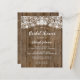 Rústica invitación a la ducha de novia en granero con adornos de encaje fino blanco. Un hermoso ilustracion de encaje blanco bordea la parte superior de la tarjeta, con las palabras "Bridal Shower" y el nombre de la futura novia en un moderno guión de estilo de caligrafía blanca. Patrón de madera de granero coincidente al revés.