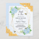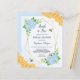 Estas invitaciones a la ducha de novias presentan un diseño floral de acuarela con flores de horangea azul, hojas, abejas, panal de miel y un marco geométrico de oro falso. También hay productos de coincidencia disponibles.