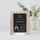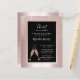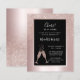 Sobre un fondo de lámina metálica rosa con rubor, nuestra elegante invitación para la fiesta de cumpleaños número 21 presenta un overlay de brillo rosa con rubor femenino con copas de champán burbujeantes que brindan por el homenajeado de cumpleaños número 21. En un marco negro con un borde de lámina rosa, encontrará texto de ejemplo que puede revisar fácilmente en la plantilla de personalización. La parte trasera de esta invitación para la fiesta de cumpleaños número 21 de hito presupuestario muestra el diseño único de brillo ombre también.