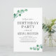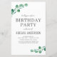 El presupuesto personaliza este estilo moderno de color de agua verde eucalipto estilo primavera estilo primavera de cualquier edad fiesta de cumpleaños Invitación sobre fondo blanco con tu mensaje y detalles. Esta elegante invitación incluye un follaje botánico elegante y moderno con una tipografía de escritura elegante, ideal para las celebraciones dulces 16, 1, 21, 30, 40, 50, 60, 70 de la fiesta de cumpleaños