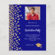 Una moderna y elegante invitación a la fiesta de graduación. Un fondo azul marino decorado con un falso confeti dorado. Personalice y agregue la foto, un nombre y detalles del fiesta. Texto blanco. 1 hoja = 1 borde impreso de invitación al borde.