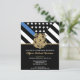 Honre la dedicación y el arduo trabajo de un nuevo agente del orden con esta invitación personalizable para la graduación de la policía. Con un emblema policial y la bandera de la fuerza policial con franjas negras y blancas en negrita y una orgullosa línea azul delgada, este diseño simboliza la fuerza, el servicio y el sacrificio. La invitación está personalizada con el nombre del graduado en letras doradas, lo que la convierte en un recuerdo memorable para amigos, familiares y compañeros oficiales. Perfecta para celebrar la graduación de la academia de policía, promoción o hito en la carrera de un futuro oficial. Invite a sus invitados con estilo y muestre su apoyo al miembro más nuevo de la comunidad de la línea azul delgada.