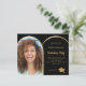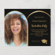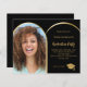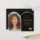 Añade tu propia foto de tamaño vertical del graduado. Un falso marco fotográfico en forma de arco dorado. Un color de fondo negro clásico. Personalice y agregue un nombre y detalles del fiesta. 1 hoja = 1 borde impreso de invitación al borde.