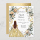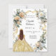 Un falso fondo dorado. Decorada con flores blancas y amarillas y una cinta dorada. Un chica con una tiara y un vestido. Personalice y agregue un nombre y detalles. Atrás: un falso fondo dorado. 1 hoja = 1 borde impreso de invitación al borde.