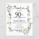 La elegante invitación a la fiesta de cumpleaños 90 incluye un marco botánico de flores blancas y hojas verdes profundas. El nombre de la persona de cumpleaños está escrito en un texto de escritura tradicional. Todo el texto se puede editar fácilmente para crear el tono de celebración correcto.