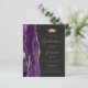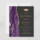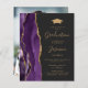 Esta moderna invitación a la fiesta de graduación de 2025 muestra una imagen acuarela de una agate gede tonos morados con falsos purpurinas dorados. La palabra "Graduación" y el primer nombre del graduado aparecen en un elegante guión de escritura a mano de color dorado en un fondo no negro, junto con un gorro de mortero de color dorado y detalles de fiesta en sans serif y cursiva. Reemplace fácilmente la imagen de muestra en la parte posterior con una foto vertical del graduado.
