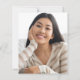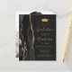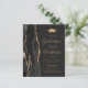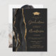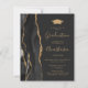 Esta moderna invitación a la fiesta de graduación de 2025 muestra una imagen acuarela de agate geode negro con falsos purpurinas de oro. La palabra "Graduación" y el primer nombre del graduado aparecen en un elegante guión de escritura a mano de color dorado en un fondo no negro, junto con un gorro de mortero de color dorado y detalles de fiesta en sans serif y cursiva. Reemplace fácilmente la imagen de muestra en la parte posterior con una foto vertical del graduado.