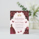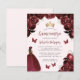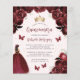 Esta encantadora invitación a la quinceañera cuenta con un borde de flores de color burdeos sobre un fondo de color burdeos pálido. Una tiara dorada, un chica de pelo oscuro con un vestido de princesa borgoñona y pequeñas mariposas borgoñonas decoran el texto. La palabra "Quinceañera" y el nombre del invitado de honor aparecen en un elegante guión de escritura a mano en burdeos, con el texto restante en letra gris sans serif.