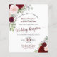 Estas invitaciones asequibles y económicas están pensadas para los invitados a la recepción y no para la ceremonia matrimonial. El diseño es elegante, con rosas acuáticos pintados a mano en tonos rosa, rojo, borgoña y coral, con una mezcla de hojas de eucalipto y vegetación. La tipografía presenta caligrafía de escritura sofisticada, y la parte posterior es un color burdeos de mármol profundo. Una forma perfecta de celebrar a su boda sin gastar una fortuna en las invitaciones.