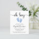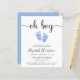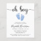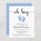 Pequeña invitación a un niño pequeño y asequible con "oh boy" en un guión elegante con toques y una acuarela azul pastel de pies de bebé. Debajo se pueden personalizar fácilmente los detalles de la rociada del bebé.