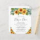 Esta rústica invitación a la rociada para bebés, respetuosa con el presupuesto y neutral en cuanto al género, incluye flores de flores de girasol y vegetación de eucalipto y "Baby in Bloom" en un guión elegante.
