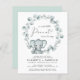 Invitación a rociar bebés, para parejas sin fines de lucro y sin fines de lucro, que incluye "Un dulce maní está en camino" en una mezcla de tipografía moderna y escritura elegante con un toque de corazón, y una acuarela de un lindo elefante verde de menta pastel en una guirnalda de vegetación eucaliptos verde. Añada los nombres de los futuros padres y los detalles de la rociada en una tipografía simple.