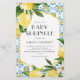 Invitación a rociar bebés con temática de limón que incluye ilustraciones acuarelas de limones, flores de limón y tejas mediterráneas. Personalice agregando nombres, fecha, hora y otros detalles. Esta invitación a rociar a los bebés con limón es perfecta para el verano y para las duchas de bebé de temática mediterránea.
