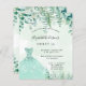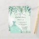 Una invitación a la moda para una fiesta de dulces 16, 16 años, tema del bosque encantado. Un fondo de color verde acuático con helechos y eucaliptos, un vestido verde. El nombre está escrito con una escritura de estilo con letras a mano moderna. Personalice y agregue los detalles de su fiesta.