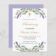 Un fondo blanco decorado con flores de lavanda y vegetación eucaliptica. Personalización y nombre y detalles de la ceremonia. Letras de color negro y dorado. Fondo de color lavanda.