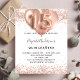 Para una elegante Quinceañera, 15 años. Un elegante fondo blanco. Decorado con oro rosa, purpurina falso rosa, chispas y globos. Personalice y agregue un nombre y detalles del fiesta. El nombre está escrito con un guión de estilo con letras a mano, número 15 con fuentes de estilo globo.