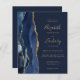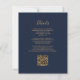 El borde izquierdo de esta elegante y moderna invitación a la boda incluye una acuarela azul marino bordeada por un falso purpurina de oro. El texto del personalizable combina la escritura a mano de color dorado, las fuentes de copperplate y las tipografías cursivas en un fondo azul marino. Añada detalles adicionales en la parte posterior, junto con un código QR para ayudar a sus huéspedes a visitar su sitio web boda.