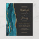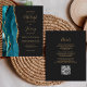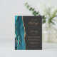 Ahorre el coste de imprimir y enviar por correo tarjetas RSVP independientes con esta elegante y moderna invitación a boda todo en uno. El borde izquierdo tiene una verde azulada agata de color azul bordeada por un purpurina de imitación dorado. El texto del personalizable combina la escritura a mano de color dorado, las fuentes de copperplate y cursiva sobre un fondo negro de pizarra. El reverso proporciona espacio para los detalles de los bodas sobre un fondo negro de pizarra sólida, junto con un código QR que los huéspedes pueden explorar para visitar su sitio web y RSVP.