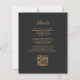 Ahorre el coste de imprimir y enviar por correo tarjetas RSVP independientes con esta elegante y moderna invitación a boda todo en uno. El borde izquierdo tiene una verde azulada agata de color azul bordeada por un purpurina de imitación dorado. El texto del personalizable combina la escritura a mano de color dorado, las fuentes de copperplate y cursiva sobre un fondo negro de pizarra. El reverso proporciona espacio para los detalles de los bodas sobre un fondo negro de pizarra sólida, junto con un código QR que los huéspedes pueden explorar para visitar su sitio web y RSVP.
