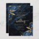 Esta elegante invitación a la boda incluye ramos florales de color azul marino, adornados con un Relieve metalizado de imitación dorado en dos esquinas, sobre una imagen de fondo de un ágata color azul marino. El texto del personalizable combina fuentes seriales, cursivas y manuscritas de color dorado. El lado inverso proporciona espacio para los detalles del boda, junto con un código QR que los huéspedes pueden explorar para visitar su sitio web y RSVP, lo que ahorra el costo de imprimir y enviar tarjetas RSVP separadas.