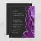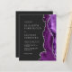 El borde derecho de esta elegante y moderna invitación a la boda incluye un borde de ágata color morado adornado con un falso purpurina de plata. El texto del personalizable combina serif de color gris plateado, copperplate y fuentes cursivas sobre un fondo negro de pizarra. El reverso proporciona espacio para los detalles del boda sobre un fondo negro de pizarra sólida, junto con un código QR que los huéspedes pueden explorar para visitar su sitio web y RSVP, lo que ahorra el coste de imprimir y enviar tarjetas RSVP separadas.