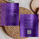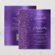El borde izquierdo de esta elegante y moderna invitación a la boda incluye un borde falso purpurina morado. El texto del personalizable combina la escritura a mano blanca, la copperplate y las letras cursivas en un fondo metalizado malva. El reverso proporciona espacio para los detalles de los bodas en un fondo metalizado morado, junto con un código QR que los huéspedes pueden escanear para visitar su sitio web y RSVP, lo que ahorra el coste de imprimir y enviar tarjetas RSVP separadas.