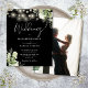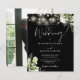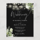 Esta elegante invitación a bodas blancas y negras, con luces de cuerdas de bonito y vegetación floral, se puede personalizar con tu información en la tipografía de moda con tu foto especial al revés. Diseñado por Thisisnotme©