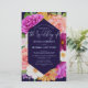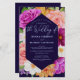 Impresionante diseño floral con rosas, peonías, cosmos, dahlia y flores de iris. Fondo azul oscuro. Letras elegantes. Púrpura, rosa, blanca, amarilla, rosa rubor, verde. Colores audaces y saturados. Diseño boda de acuarela moderno y festivo.