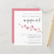 Invitación para el compromiso con el florecimiento del cerezo de Sakura. Un precio económico menor 4,5" x 5,6" alternativa. Disponible en un ALMACENAMIENTO DE TARJETAS SEMI-GLOSS de 110 lb que es la opción predeterminada (más grueso para las invitaciones), O UN ALMACENAMIENTO DE PAPELES DELGADOS SATIN FINISH DE 80 lb (ideal para los gabinetes). Los sobres son un extra opcional y son algo más grandes que el tamaño de la tarjeta. Estilo minimalista moderno con una sola rama de Sakura florals a través de la página desde el lado izquierdo. El compromiso se establece en un estilo informal de escritura a mano y se coloca encima de las hojas junto con sus nombres, con los otros detalles debajo. Personaliza fácilmente los detalles a tu propia persona. Al revés se encuentra un fondo rosado polvoriento. Puede cambiar el texto y los colores de fondo a cualquiera de sus opciones para que coincidan con el tema de color boda.