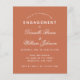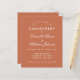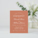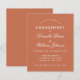 Una sencilla invitación a la fiesta de compromiso con un color moderno: terracota (marrón rojizo). Sólo tiene texto blanco sobre fondo de terracota. Los nombres se escriben en un guión caligráfico elegante, el resto en mayúsculas. la primera línea es el texto en arco.
