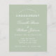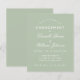 Una sencilla invitación a la fiesta de compromiso con un color moderno: verde sabio. Sólo tiene texto blanco sobre fondo verde sabio. Los nombres se escriben en un guión caligráfico elegante, el resto en mayúsculas. la primera línea es el texto en arco.