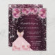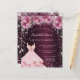 Una invitación moderna, elegante y glamurosa para una fiesta de 15 años en Quinceañera. Un fondo burdeos de aspecto metálico con un polvo falso purpurina rosado, un vestido y flores rosadas. El nombre está escrito con una escritura de estilo con letras a mano moderna. Personalice y agregue los detalles de su fiesta.